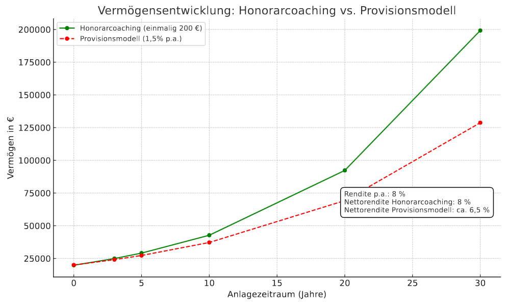 Ich arbeite bewusst auf Honorarbasis, um Ihnen ein unabhängiges und objektives Coaching zu bieten. Auf Provisionsbasis tätige Coaches oder Berater - wie es in der Regel bei Banken der Fall ist - können in Konflikte geraten, da ihre Empfehlungen von Verkaufsprovisionen abhängig sind. Dies kann zu für den Kunden ungeeigneten oder unnötig teuren Produkten führen. Als Honorarkunde profitieren Sie von einem transparenten, neutralen Coaching, das ausschließlich auf Ihre Bedürfnisse und Ziele ausgerichtet ist.